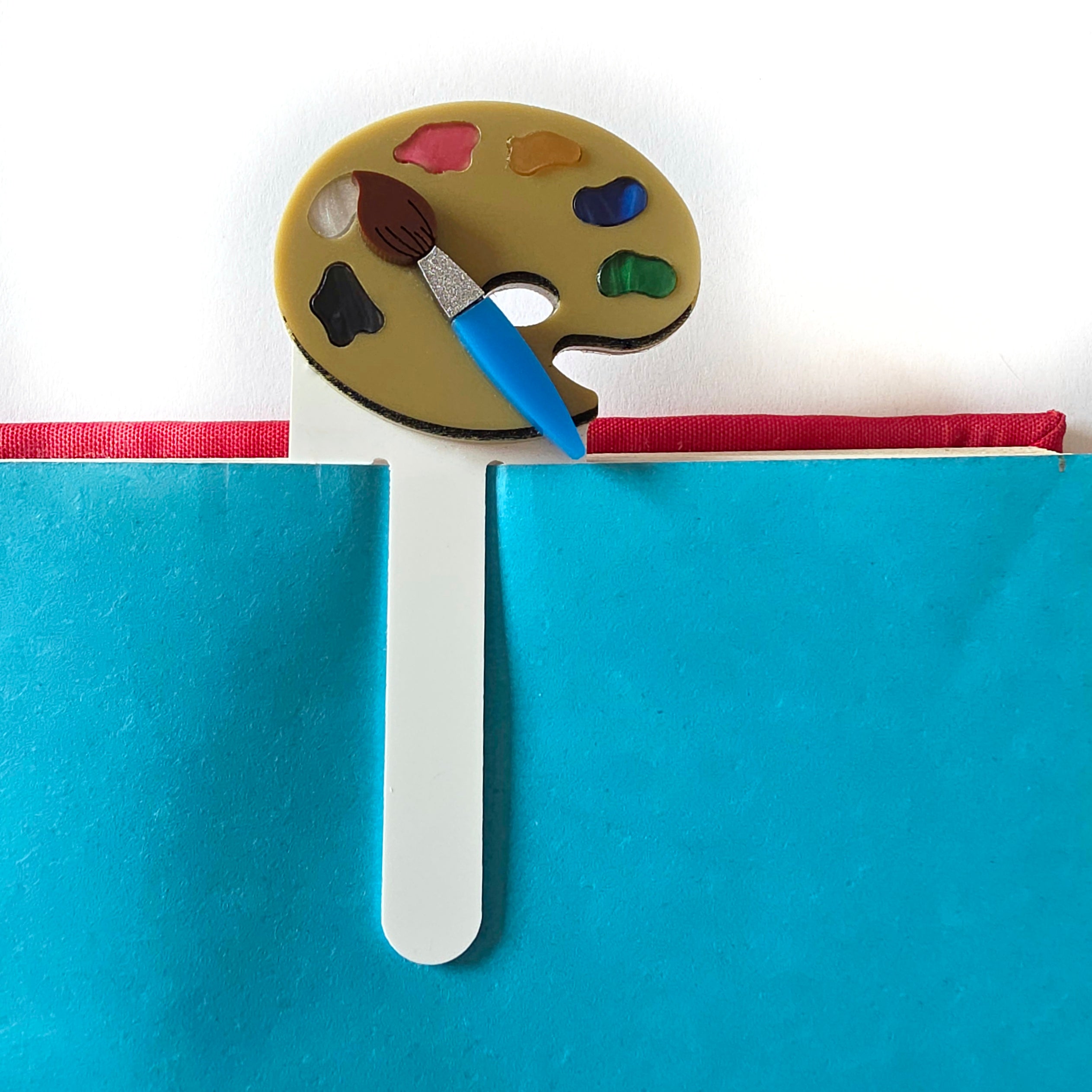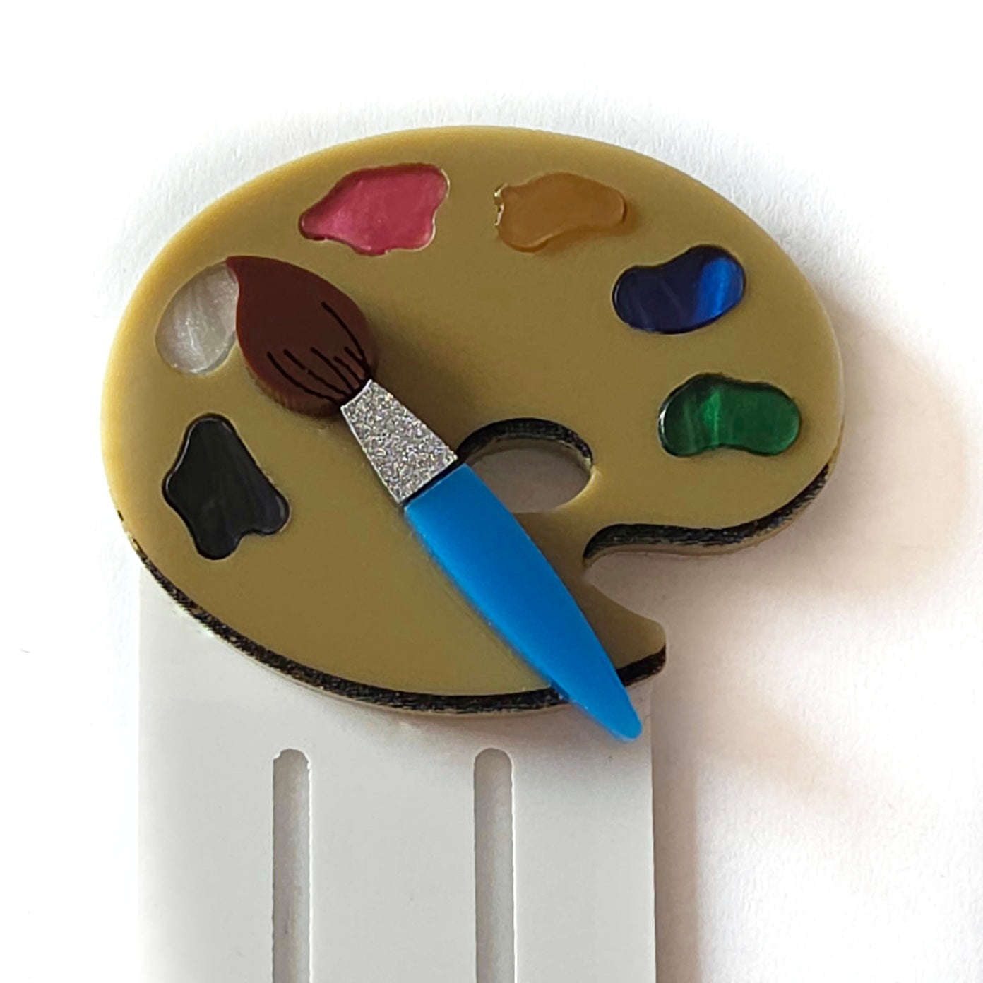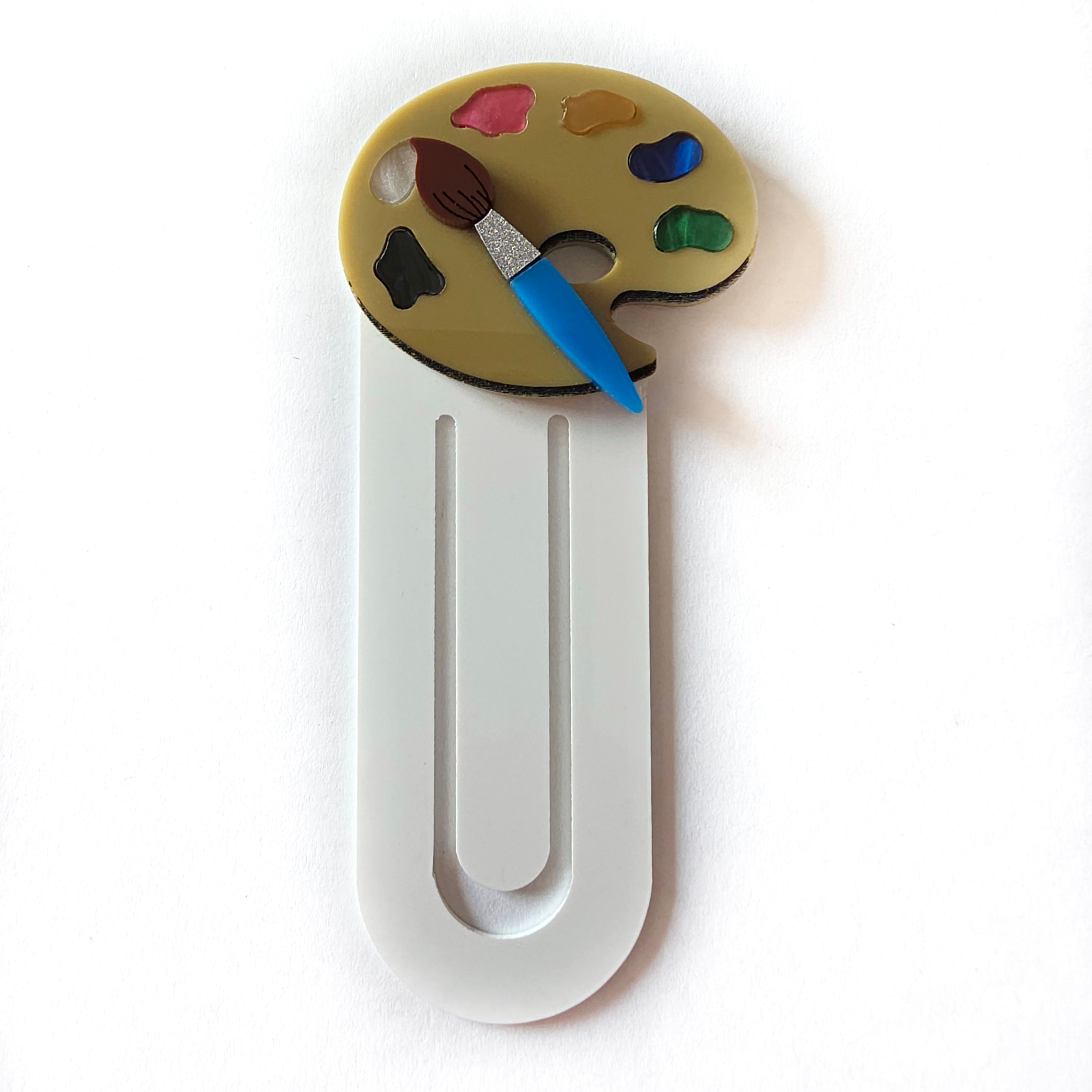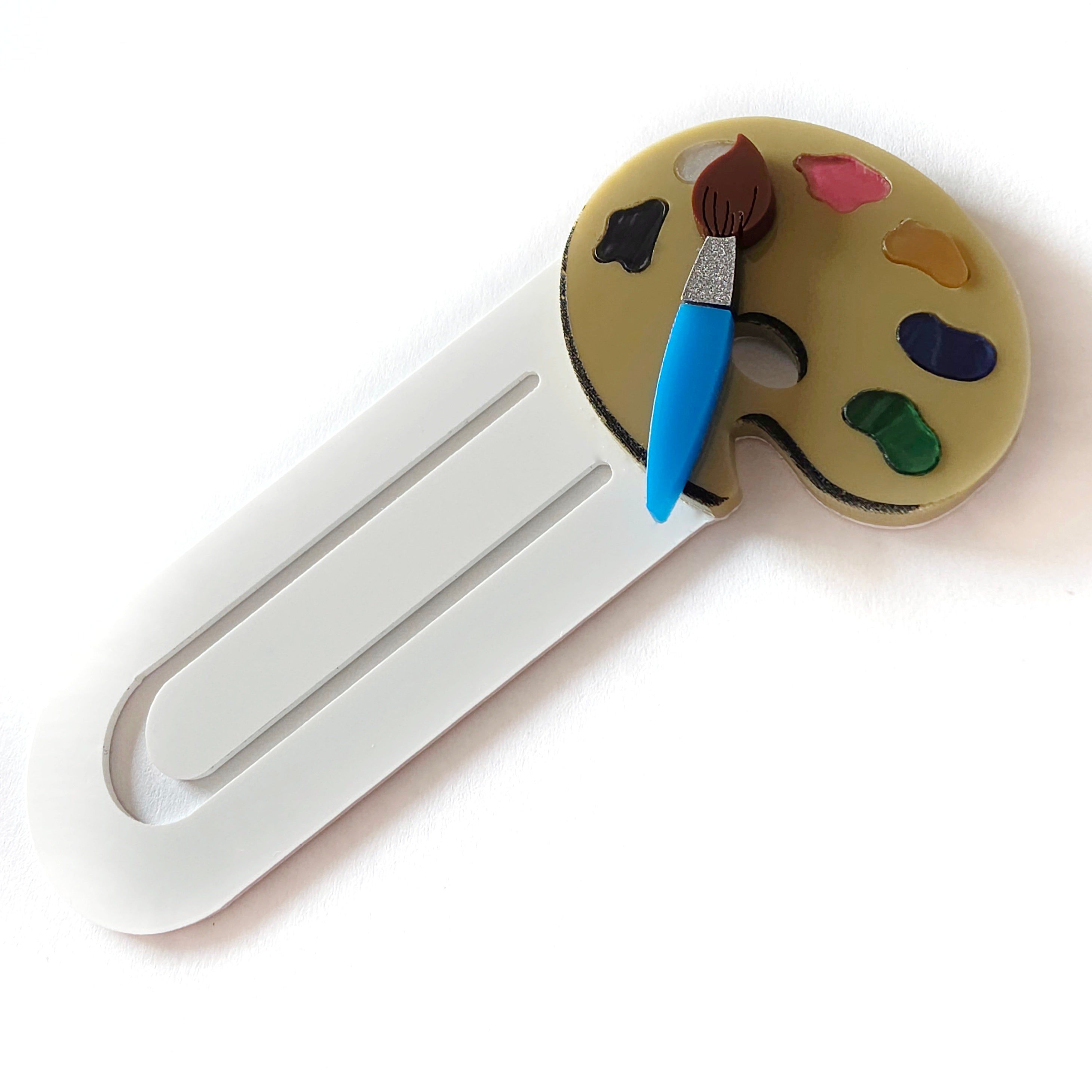 Segnalibro in plexiglass decorato con una piccola tavolozza artistica e dotato di una sottile pinza (spessore 1 mm) che mantiene fermo il foglio.
